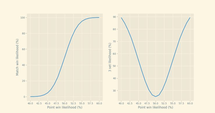 How does the likelihood of winning a tennis match change as the likelihood of winning a single point changes? How about the probability of a best-of-five match ending in three sets? Let’s have some fun exploring some of these questions using a Python tennis match simulation program.